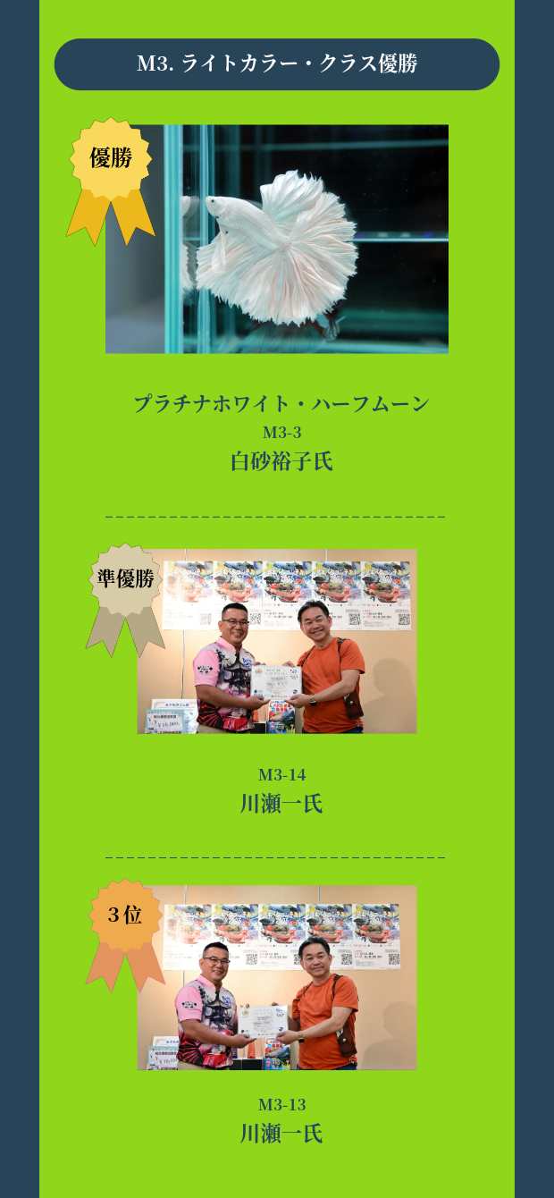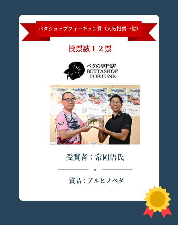 ※コンテストでご出品されたベタは、当店が細心の注意を払ってお預かりいたしますが、 ヒレなどの欠損や状態不良、死亡や盗難、紛失などにかんしては、当店は一切責任を 負いませんので、ご了承のうえご出品ください。またご出品の際の当店への発送、 およびコンテスト終了後のご返送の間も同じです。また、コンテストの結果にかんする クレームは一切お受けできませんので、ご了承ください。 ※主催者側で撮影させていただきました写真の著作権につきましては、原則として主催者側に 帰属するものとします。あらかじめご了承ください。 ※出品された個体や出品者様の写真および出品者様のお名前は、ウェブ上や雑誌などで 掲載することがあります。あらかじめご了承ください。